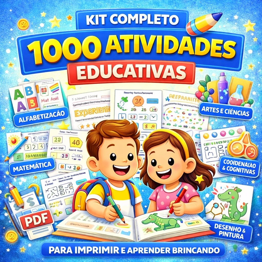 O Kit Completo de Atividades Educativas é um material digital com 1000 atividades prontas para imprimir, desenvolvido para apoiar o aprendizado infantil de forma lúdica, prática e organizada. O que está incluso no Kit? 1000 atividades em PDF, prontas para imprimir, divididas em: